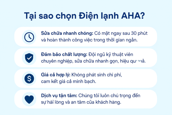Việc lựa chọn một đơn vị sửa chữa máy lạnh đáng tin cậy không chỉ giúp bạn tiết kiệm thời gian, chi phí mà còn hạn chế tối đa các rủi ro phát sinh không mong muốn. Chính vì vậy, Điện lạnh AHA cam kết cung cấp dịch vụ nhanh chóng, hiệu quả, minh bạch về giá cả, cùng đội ngũ kỹ thuật viên lành nghề, tận tâm.